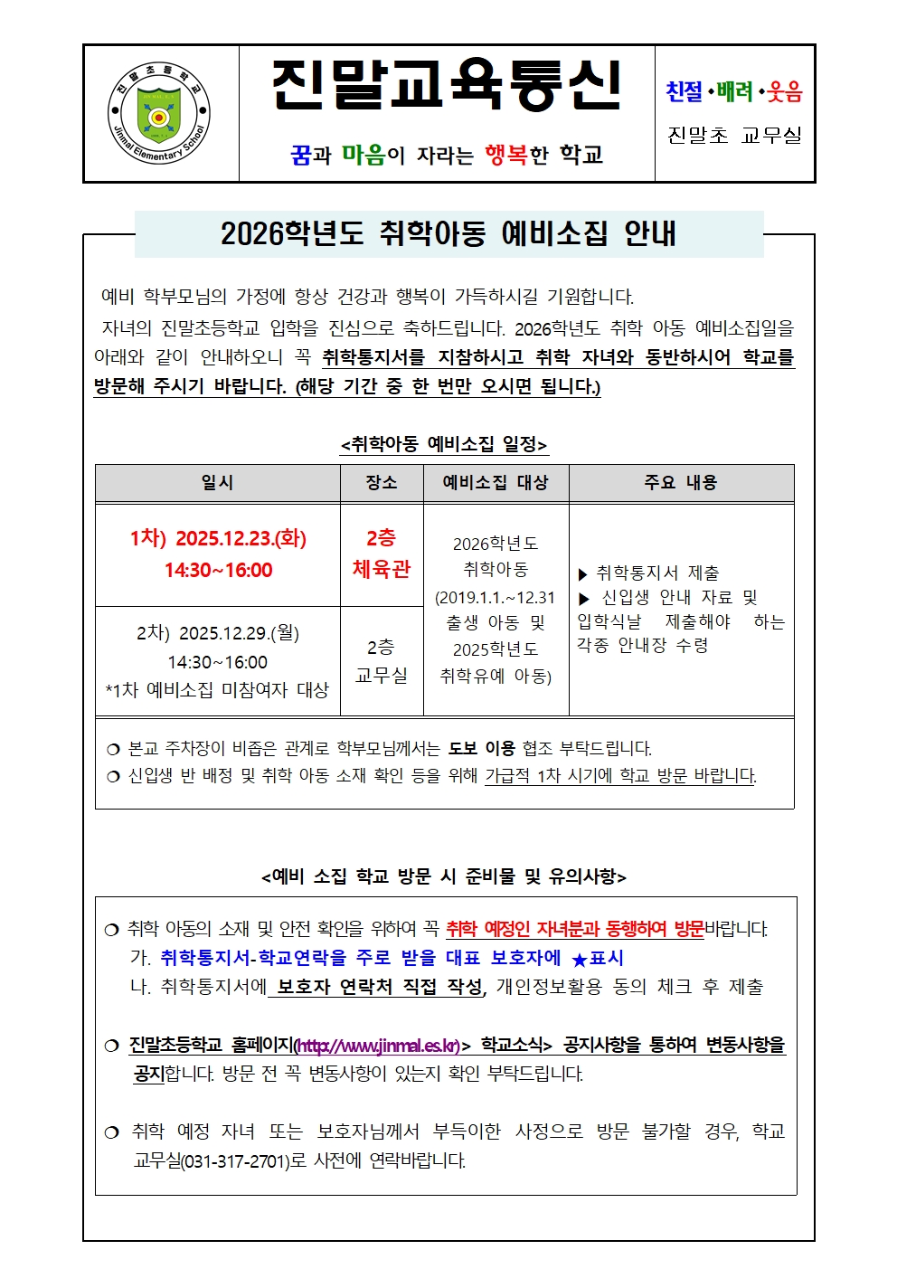 ÀÚ³àÀÇ Áø¸»ÃʵîÇб³ ÀÔÇÐÀ» Áø½ÉÀ¸·Î ÃàÇϵ帳´Ï´Ù. 2026Çг⵵ ÃëÇÐ ¾Æµ¿ ¿¹ºñ¼ÒÁýÀÏÀ» ¾Æ·¡¿Í °°ÀÌ ¾È³»ÇÏ¿À´Ï ²À ÃëÇÐÅëÁö¼­¸¦ ÁöÂüÇϽðí ÃëÇÐ ÀÚ³à¿Í µ¿¹ÝÇϽþî Çб³¸¦ ¹æ¹®ÇØ Áֽñ⠹ٶø´Ï´Ù. (ÇØ´ç ±â°£ Áß ÇÑ ¹ø¸¸ ¿À½Ã¸é µË´Ï´Ù.)